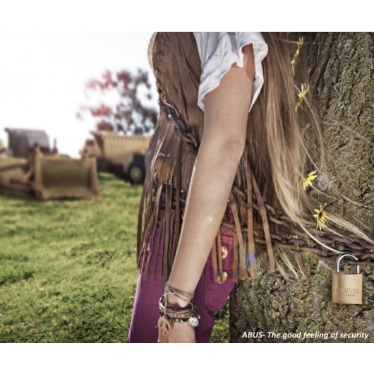 I wanted to approach this concept from an alternative angle and so chose to depict the lock securing a 'tree-hugger' to a tree. The 'hippy' is able to trust the ABUS lock, and is unworried by the bulldozers etc in the background, as she knows that the ABUS lock is steadfast and dependable.